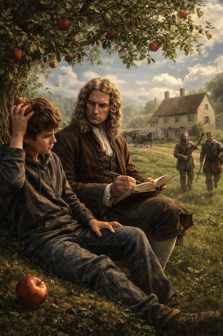 Точно такава картина се откри пред Джими и на днешната му разходка из имението. Съзря в близката градина как Нютон седи замислен под едно ябълково дърво и държи тетрадката в ръцете си. Момчето се приближи много тихо и приседна до младия учен. Наоколо ги обгръщаше пълна тишина, нарушавана единствено от песента на птиците, от краткия звън на хлопките, окачени на вратовете на кравите и от жуженето на случайно объркала своя път пчела. Двамата мълчаха все едно не съществуваха един за друг. Тогава усетиха силен полъх на вятъра, който разклати увисналите клони на дървото, отрупани с плодове.