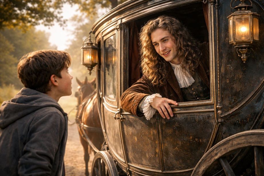 Внезапно обаче дочу зад гърба си тропот на копита и скърцането на колела. Навреме успя да отскочи, а покрай него премина карета с впряг от два шарени коня и кочияш с наметало, който държеше здраво юздите на животните. След няколко десетки метра каретата внезапно спря и от нейното прозорче се показа глава на млад мъж, който му помаха да се приближи. Джими се затича и спря пред прозорчето.
