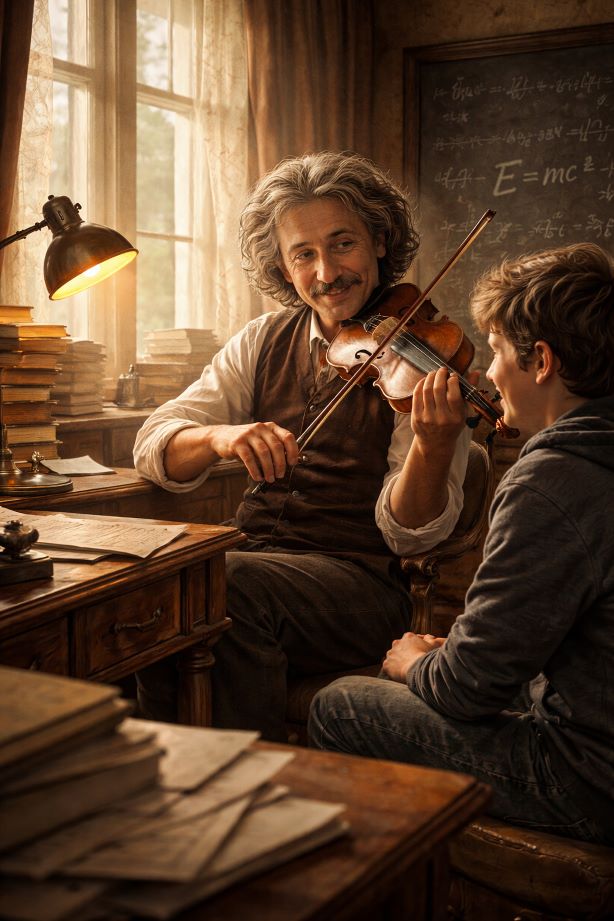 Джими се изкачи бързо, като просто връхлиташе по стълбите и вземаше по две стъпала наведнъж. Озова се в дълъг коридор, от двете страни на който се редуваха тапицирани врати на различни кабинети. Вратите имаха месингови табели с номера и надписи, но без имена. Беше забравил да попита за номера на кабинета, в който работеше Айнщайн. Понечи да се върне, но звукът от настройването на цигулка му помогна да се ориентира. Когато застана пред вратата на кабинета с надпис „Младши експерти“, разпозна първите акорди на „Малка нощна музика“ от Моцарт. Все пак беше ходил на уроци по китара и знаеше това-онова.