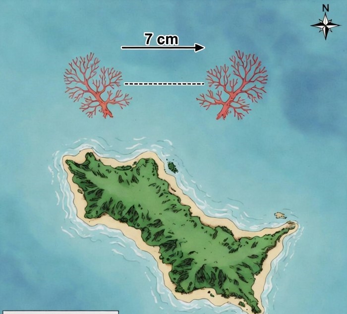 Карта на малък остров показва, че разстоянието между два коралови рифа е 7 cm. Мащабът на картата е 1 : 100 000.
