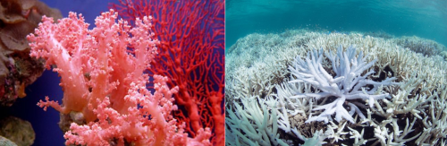 в) Запишете две човешки дейности, които увеличават риска от избелване на коралите. Коралите са оцветени естествено в нюансите на червено, розово и оранжево.