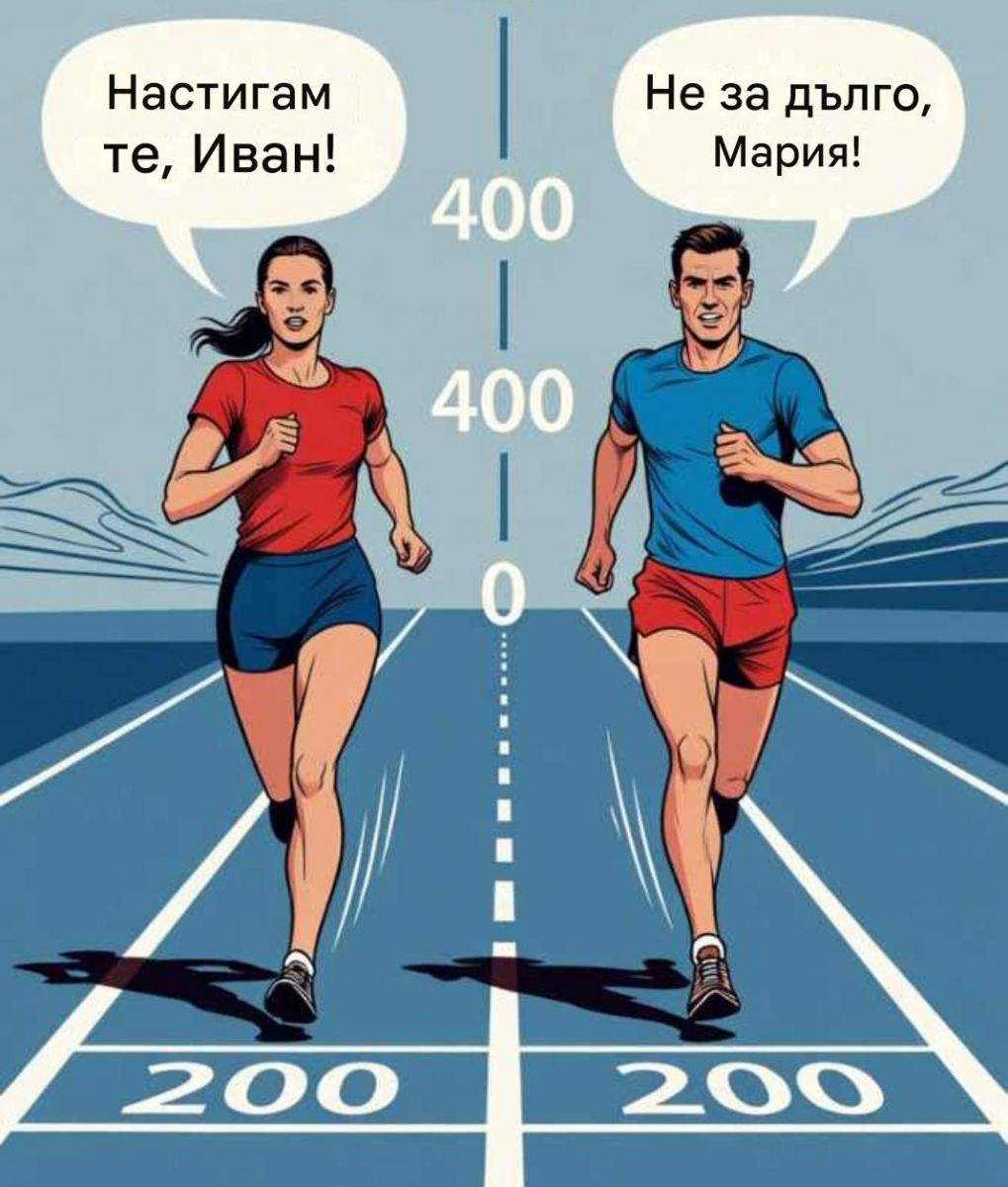 Иван настигa Мария 100 s след своя старт, или 120 s след началото на състезанието (тъй като тръгва 20 s по-късно).