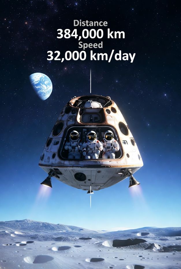 Космически апарат с 4 астронавти излита към Луната, която е на разстояние приблизително 384 000 km, като се движи равномерно със скорост 32 000 km/ден.