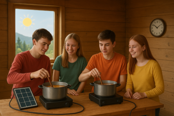 – Група А ползва за 1 h котлон свързан със соларен панел, който при слънчево време има мощност 800 W.