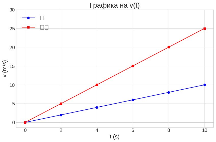Зад.1 Велосипедист и моторист започват да се движат праволинейно от състояние на покой. Разгледайте графиката за зависимостта на скоростите им за интервал от време 10 s. Използвайте данните от графиката и определете: