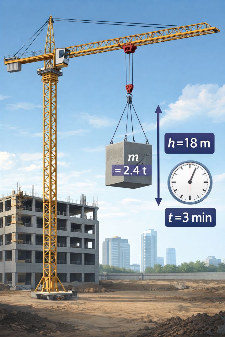 Зад.5 При строеж на нова спортна зала строителен кран повдига вертикално бетонен блок с маса 2,4 t на височина 18 m. Повдигането се извършва равномерно за време 3 min. Приемете земното ускорение g=10 m/s2. Да се намери: