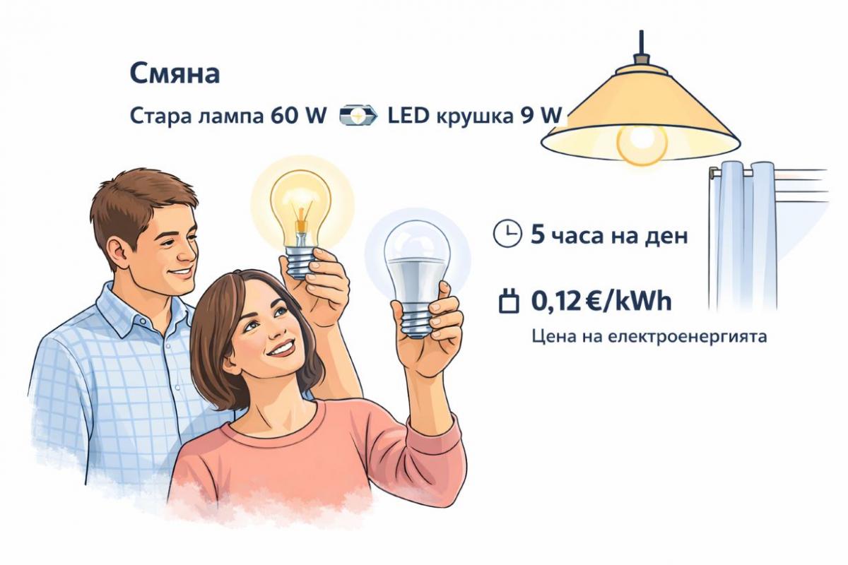 Зад.7 Семейство заменя стара лампа (60 W) с LED крушка (9 W). Крушката работи по 5 часа на ден. Цената на електроенергията е 0,12 €/kWh. Намерете:
