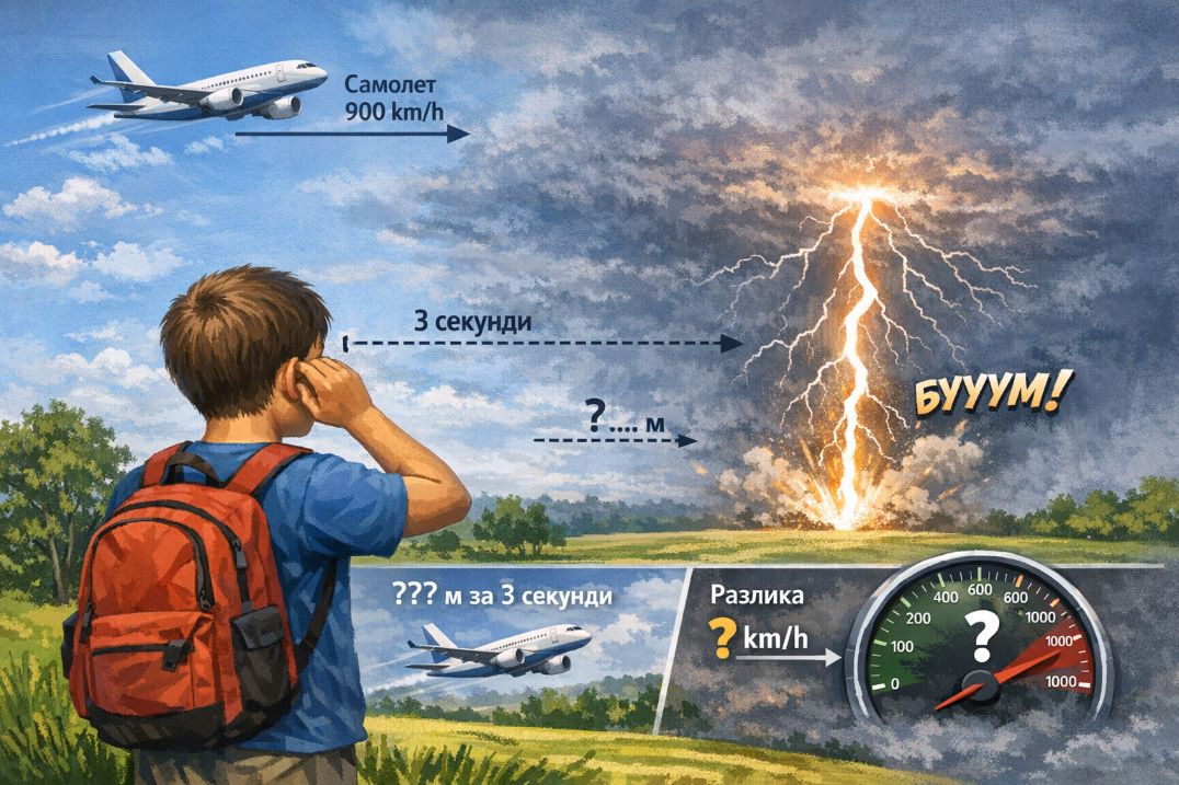 а) На какво разстояние от ученика (в метри) е ударила мълнията?