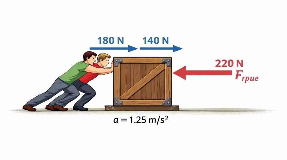 Зад.2 Стефан и Георги опитват да преместят тежък дървен сандък по пода на склад. Явор бута сандъка с хоризонтална сила F1= 180 N, а Иван му помага със сила F2 = 140 N в същата посока. Поради грапавия под върху сандъка действа сила на триене Fтр.= 220 N. Сандъкът започва да се движи от покой с постоянно ускорение 1,25 m/s². Колко е масата на сандъка?