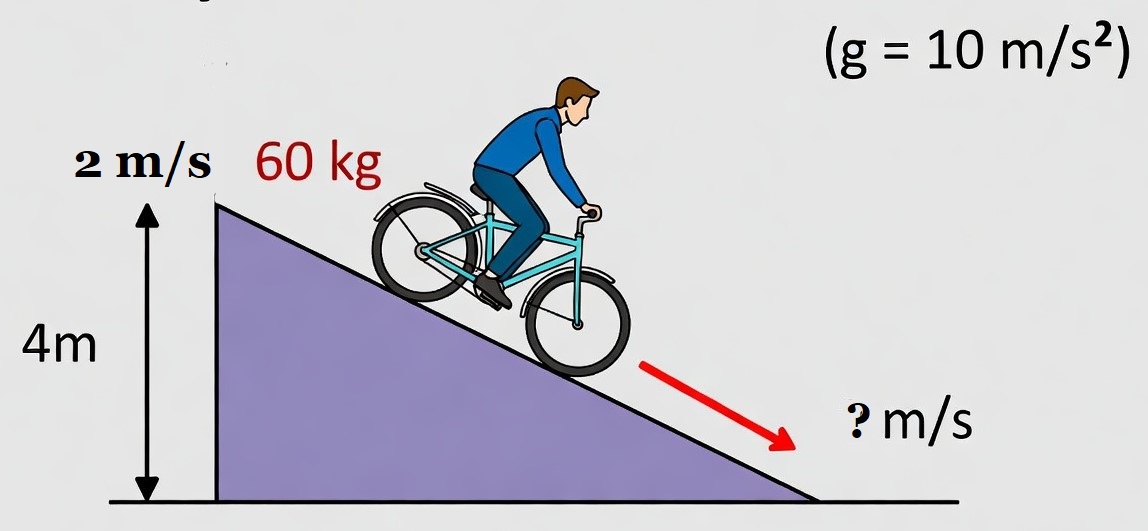 Зад.3 Ученик кара колело по лек склон. В горната част на склона (на височина 4 m над земята) скоростта му е v0 = 2. Приемете, че масата на ученика заедно с колелото е 60 kg, а загубите поради триене и съпротивление на въздуха са пренебрежими. (приемете g=10 m/s2). Намерете: